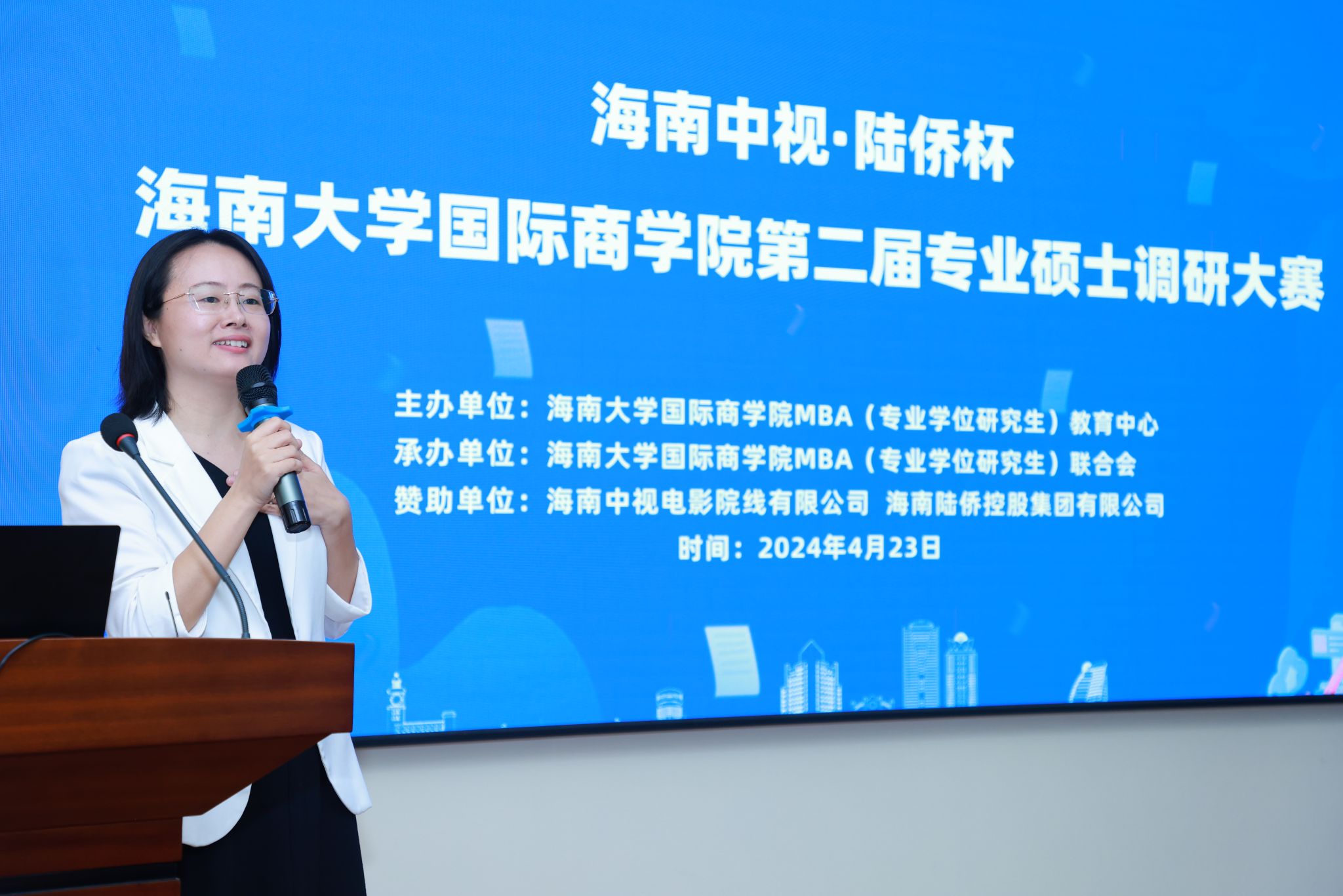 4月23日,调研大赛决赛开幕式在社科楼B112顺利举办。海南大学国际商学院院长唐宁玉教授、党委负责人、副院长付景涛教授,农业硕士学术主任邓须军,朱月季教授、张慧副教授、韩葱慧副教授等导师代表,海南中视电影院线有限公司总经理张山、海南陆侨控股集团有限公司行政人事总监李蓓、海南睿丰集团有限公司董事长彭崇香、海南睿丰贸易集团有限公司商务经理陈蔚蓝、海南广陵高科实业有限公司董事长戴扬、中国热带农业科学院成果转化处副处长蚁秀清副研究员、海南科技职业大学公共教学部主任兼党支部书记王燕萍、罗牛山集团博士后工作站负责人万长华、汽车之家能源空间站海口站总经理李德隆、海南日报有限责任公司/海报教育集团财务总监田静静以及参赛学生等100余人参加了本次活动。