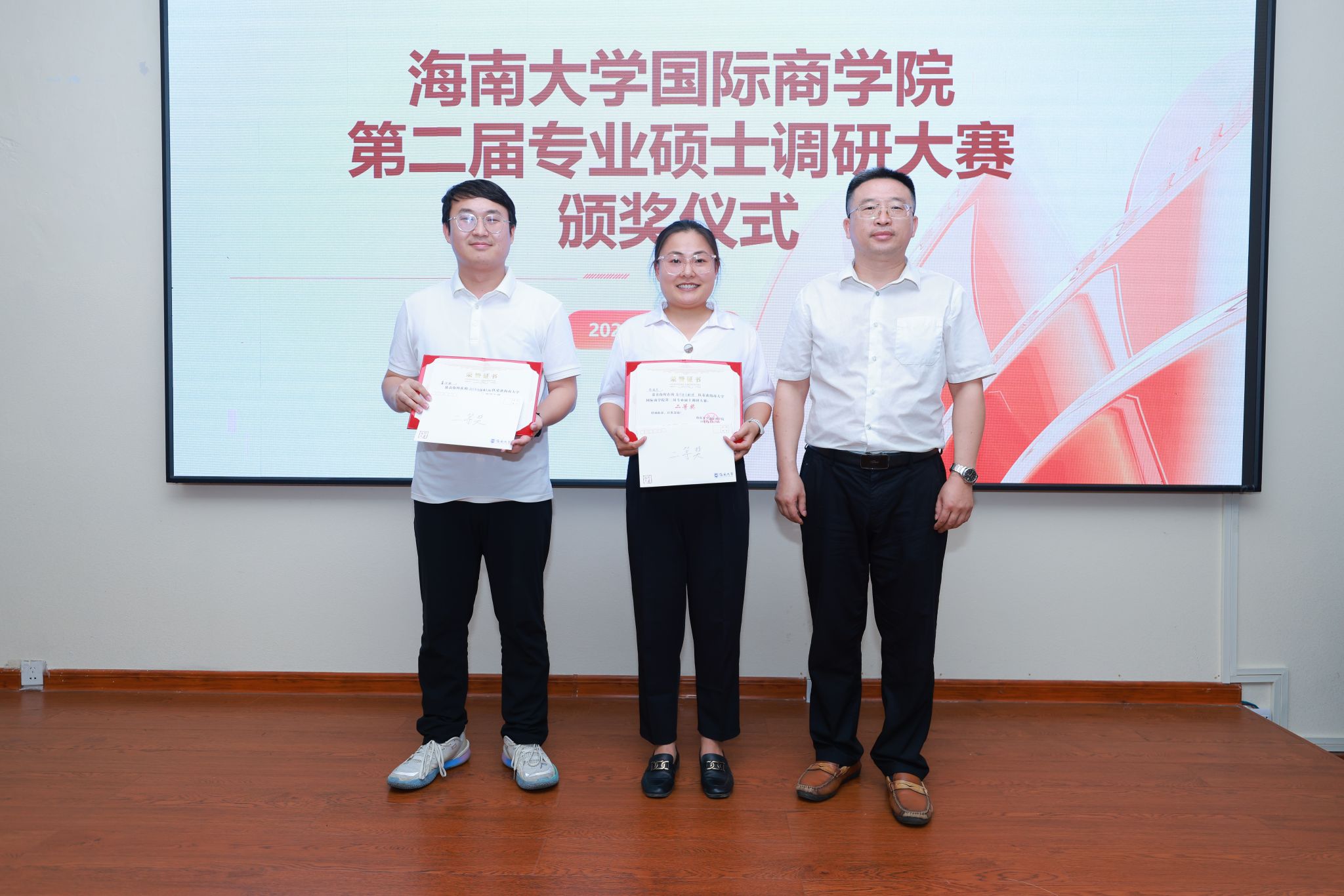 荣获一等奖的四个团队分别为:森秘研究所(MBA)、南海六粒粟(农业硕士)、四小龙取经队(农业硕士)、自贸港冲冲冲(会计专硕)。院长唐宁玉和党委负责人共同为获得一等奖的参赛队伍颁奖。