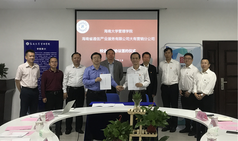 1月9日,海南大学管理学院与中国通信服务海南公司大有营销分公司在海南大学管理学院社科楼B320签署战略合作协议。海南大学副校长傅国华、中国通信服务海南公司党委书记、总经理张文义,海南大学管理学院党委书记邢谷川、副院长张德生、副院长赵达、副处级辅导员符涛、副院长付景涛以及骨干教师出席活动,中国通信服务海南公司人力资源部经理张荣宝、大有营销分公司总经理郑文涛、副总经理石瑞、副总经理许友以及骨干员工参加。