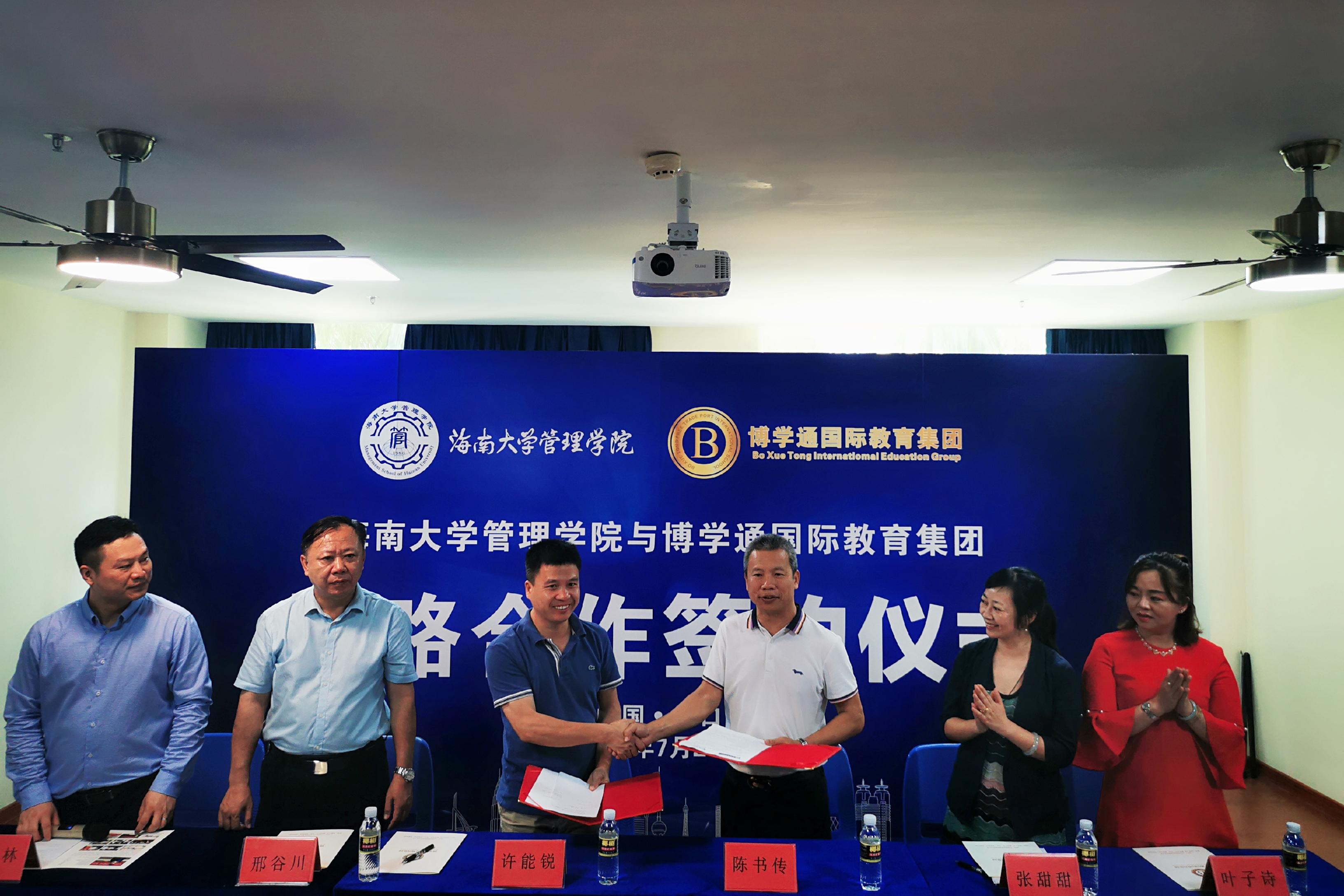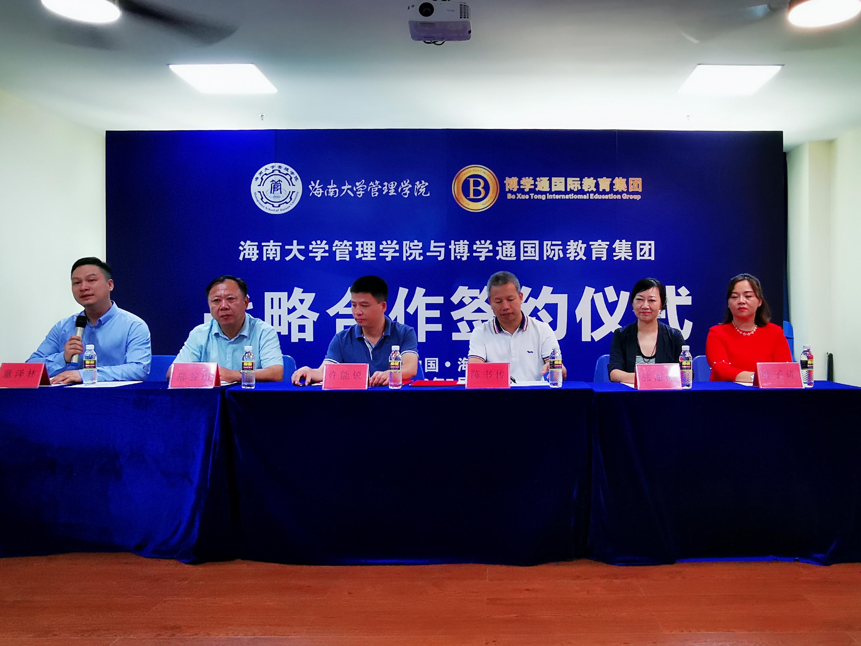 7月27日上午,海南大学管理学院与博学通国际教育集团签署战略合作协议。双方将围绕联合举行管理培训项目、联合开展管理咨询项目、校企文化交流、实习实践合作等方面展开合作,共同致力于培养海南自贸港建设高级管理人才。海南大学管理学院党委书记邢谷川、管理学院副院长许能锐、博学通国际教育集团董事长、博学通自贸港国际学院院长兼海口市龙华区工商联(总商会)主席/会长陈书传等出席签约仪式。
