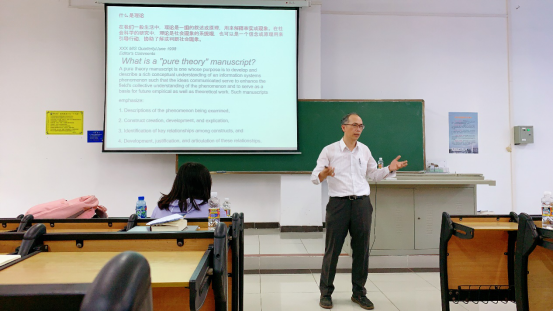 下午3:30,萧教授在海南大学5号教学楼211教室继续为师生们带来一场精彩的学术讲座。萧教授以问题为导向,提出了“什么是理论的贡献?如何发掘理论的缺口?如何写出理论的贡献?”三个问题,并给予了回答。萧教授首先从理论的概念出发,向同学们先后介绍了科技接受模式,任务、科技适配理论,服务质量理论,期望确认理论,说明了理论对于期刊论文写作的贡献和重要性;随即从期望确认理论运用于信息系统领域、资料收集和研究模式三个角度回应如何发掘理论的缺口的问题。最后,萧教授以一篇整合ECT-IS和efficacy理论的文章为例子,回答期刊文章如何提出理论贡献。