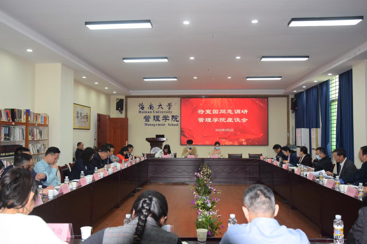 符宣国充分肯定了学院班子的工作,赞赏了"道器并举,商济天下"的院训和较好的育人氛围。他表示,管理学院师生朝气蓬勃,学院整体势头发展较好,特色鲜明,成果显著。在下一步发展中,学院要牢记习近平总书记关于“要支持海南大学创建世界一流学科”的殷切嘱托,坚持立德树人根本任务,坚持人才强院战略,坚持高质量发展,始终以服务国家战略和海南经济社会发展为己任,不断开拓进取,求索创新。学院班子要进一步提高政治站位,顺应时代发展趋势,把握好自贸港建设的机遇,切实谋划好整体工作,加快推动“双一流”建设,当好海南自贸港建设的参与者、参谋部、孵化器和后备队。
