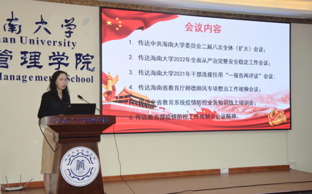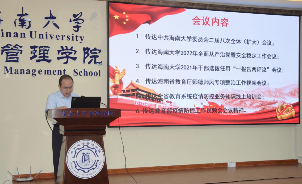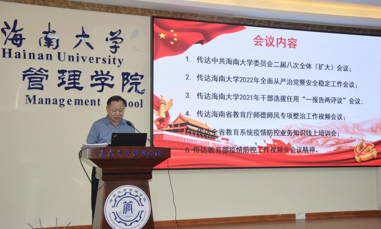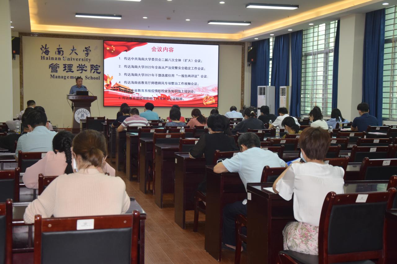 2022年3月22日下午,海南大学管理学院在社科楼B112学术报告厅召开学院工作会议。全体院领导、学院党委委员、各党支部书记及各系、办(中心)主任参加会议。
