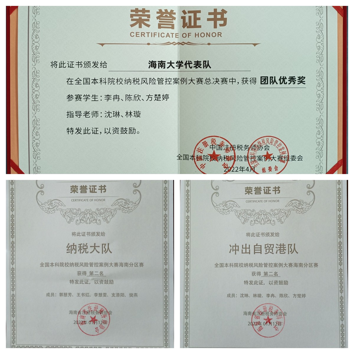 会计系沈琳老师指导的“冲出自贸港队”和郭慧芳老师指导的“纳税大队”参加了海南省分区赛,“冲出自贸港队”在2022年4月15日举行的全国本科院校纳税风险内控案例大赛总决赛中取得了团队优秀奖的好成绩。