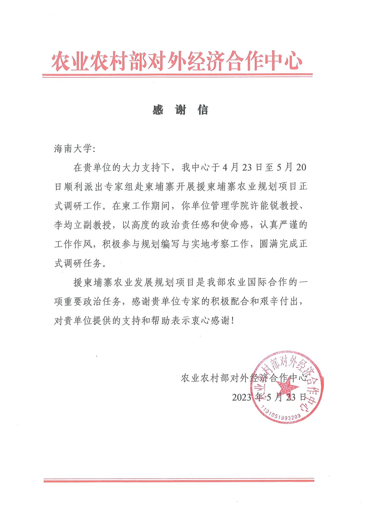 4月23日至5月20日,365bet官网 许能锐教授和李均立副教授应农业农村部对外经济合作中心邀请,赴柬埔寨开展援柬农业规划项目正式调研工作,主要负责柬埔寨天然橡胶产业发展规划编写与实地考察。在柬工作期间,许能锐教授和李均立副教授并以高度的政治责任感和使命感,认真严谨的工作作风,圆满完成任务,并获得农业农村部对外经济合作中心的感谢信。