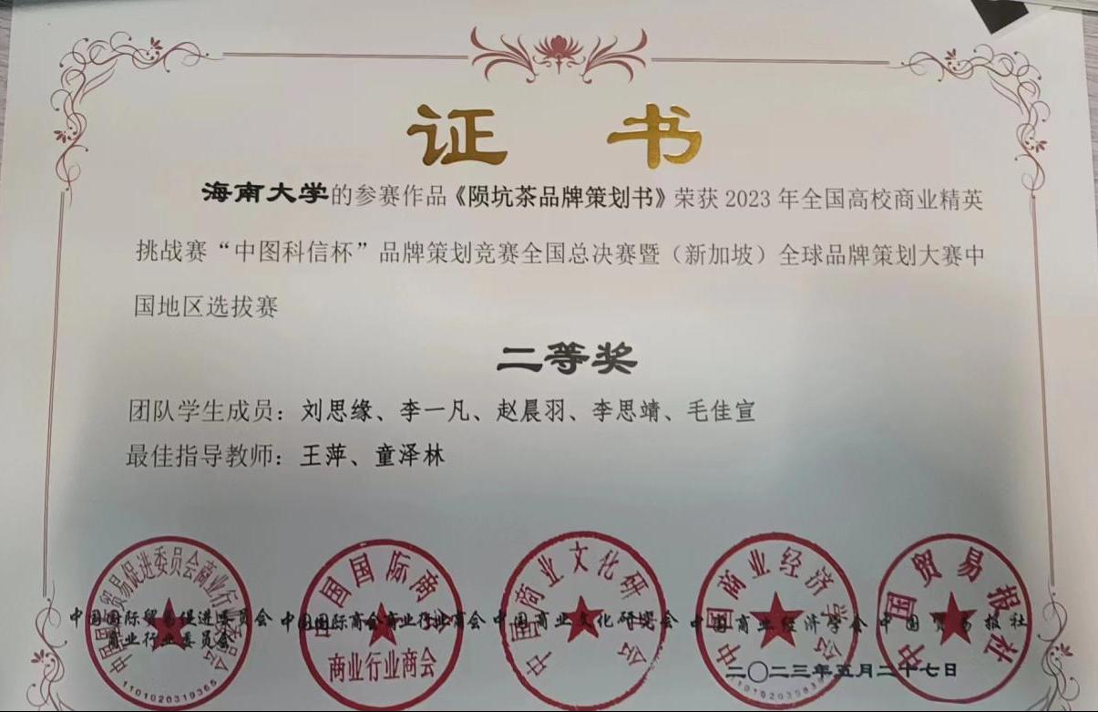 管理学院师生在5月28日闭幕的2023年全国高校商业精英挑战赛“中图科信杯”品牌策划竞赛全国总决赛暨(新加坡)全球品牌策划大赛中荣获佳绩。其中,教师组获全国一等奖,学生组获全国二等奖2项,同时,“海南天然茶叶有限公司”和“白沙邦溪黎佳山兰酒坊”两家企业获得优秀企业奖,“海南天然茶叶有限公司”还获得最具社会责任企业奖,这两家是管理学院在2023年承办的海南省乡村产业振兴带头人培育“头雁”项目的企业,通过比赛,助力品牌,赋能企业,推动了两家企业的品牌影响力,实现了管理学院的产学融合。