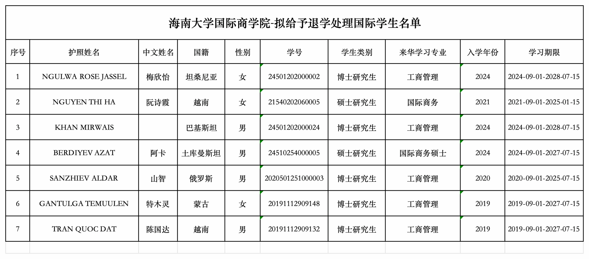 为进一步规范国际学生硕(博)研究生学籍管理工作,现按《海南大学研究生学籍管理规定(修订)》(海大党政办〔2023〕56号)第三十二条关于研究生退学管理之规定,对拟清退国际学生进行公示,具体名单如下: