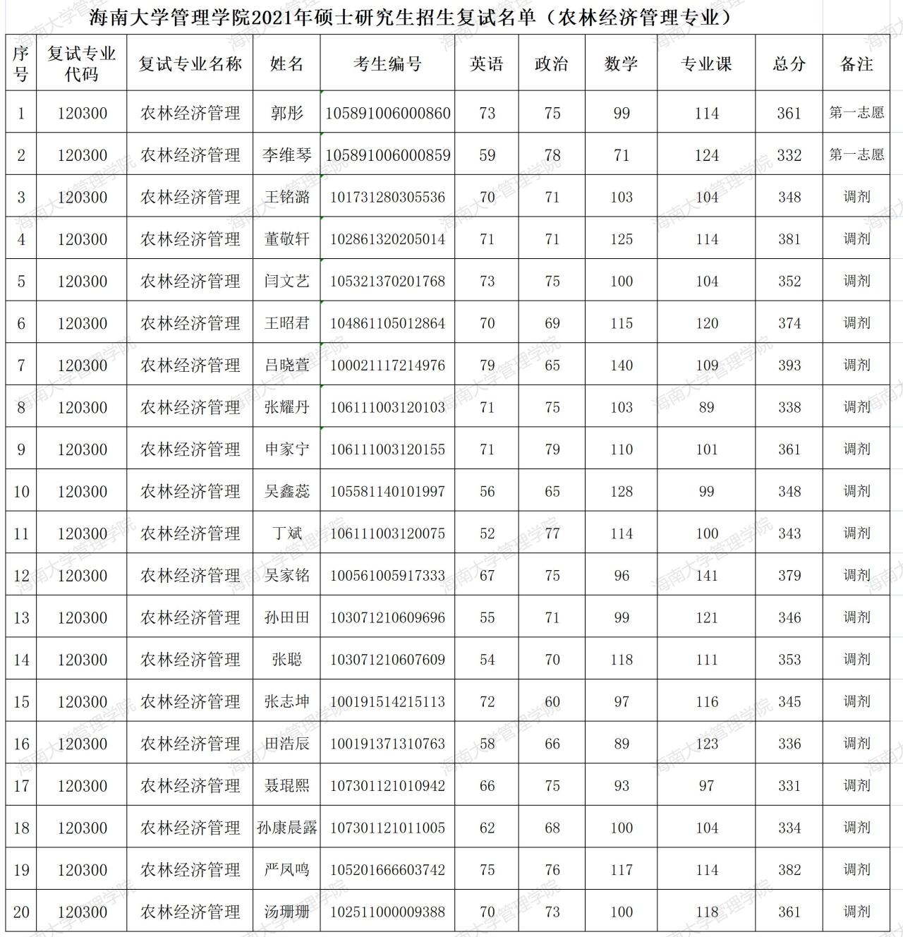海南大学管理学院2021年硕士研究生招生复试名单(农林经济管理专业)