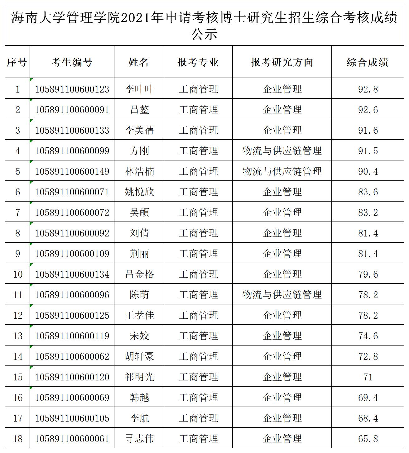 海南大学管理学院2021年申请考核博士研究生招生综合考核工作已阶段性完成,现将考生综合考核成绩公示如下。