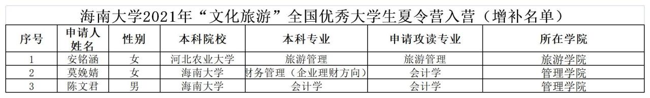 海南大学2021年“文化旅游”全国优秀大学生夏令营入营(增补名单)