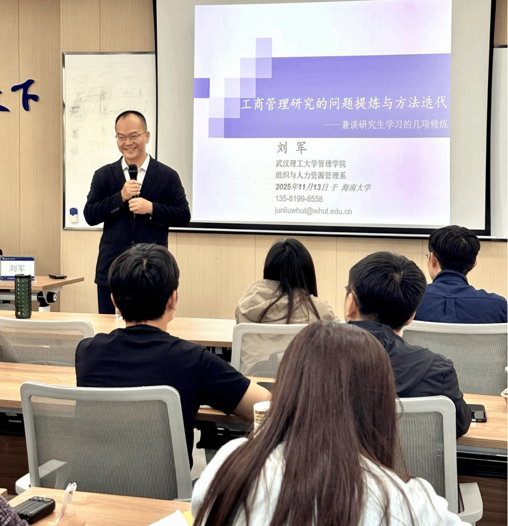 工商管理研究沙龙活动在社科楼B623顺利举办。武汉理工大学管理学院刘军教授应邀主讲。以“工商管理研究的问题提炼与方法迭代”为题。为学院师生带来一场兼具理论深度与实践指导意义的学术盛宴。本次工商管理系学术沙龙活动由学院副院长付景涛教授主持。