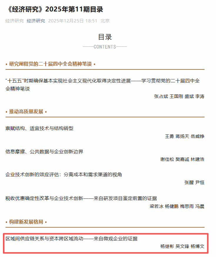 教师杨继彬以第一作者身份,在《经济研究》期刊发表题为“区域间供应链关系与资本跨区域流动——来自微观企业的证据”的学术论文。《经济研究》是经济管理类顶级期刊,隶属bet365亚洲官网