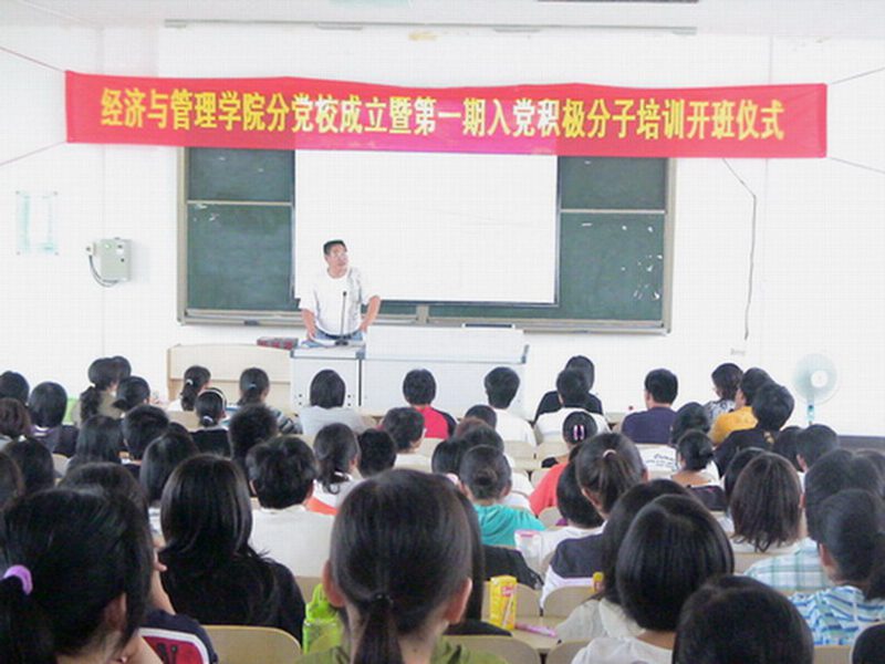 首先,俞花美老师宣读《中共海南大学委员会组织、党校关于成立学院分党校的通知》(海大党组[2008]30号)文件和学院分党校组织机构。随后,院党委副书记冯广波在开班仪式上发表重要讲话。他指出,本次培训是两个学院合并以来的第一期党课,学院开办党课培训班旨在提高入党积极分子的综合素质及业务能力,充分了解中国共产党的性质、组织、纪律等。他还强调,学院会加大党员的发展力度,使更多的学生加入党员队伍,期望大家能够认真、深入的学习党的知识,以最短的时间,将党课上好,将党的知识掌握好。