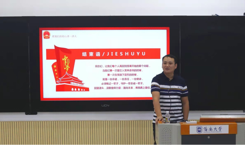2021年11月18日下午,海南大学管理学院分党校2021年下半年党课培训第四讲于五教114教室开展,管理学院党建组织员李子昂主讲,主题为《学习入党誓词,坚定理想信念》。学院116名发展对象和新一批入党积极分子参训。