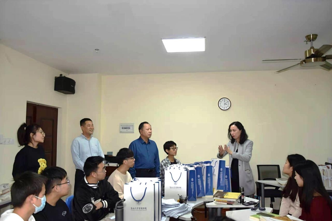 2021年12月14日下午,为考研学子助力加油,海南大学管理学院举行“东坡计划”之2022届考研送温暖活动暨冲刺动员会。管理学院院长唐宁玉、党委书记邢谷川、党委副书记易振、学生工作办公室主任肖亚奇老师在社科楼B319教室与学院考研学生代表进行亲切交谈。