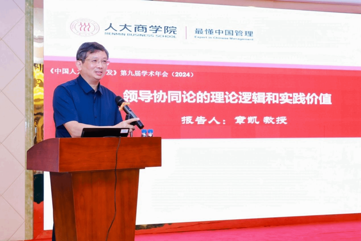中国人民大学商学院章凯教授作了题为“领导协同论的理论逻辑与实践价值”的主题报告。他认为领导协同论是一个新的发展方向,强调领导者应作为资源整合者促进团队协同,同时分享了关于管理理论构建的哲学思考,为管理理论与实践创新提供新视角。