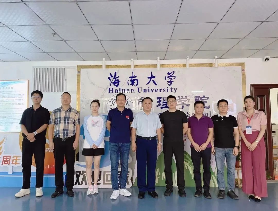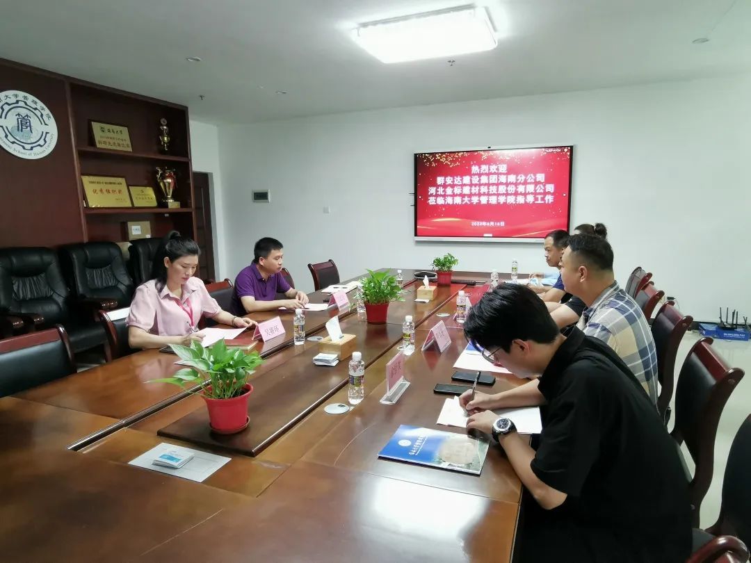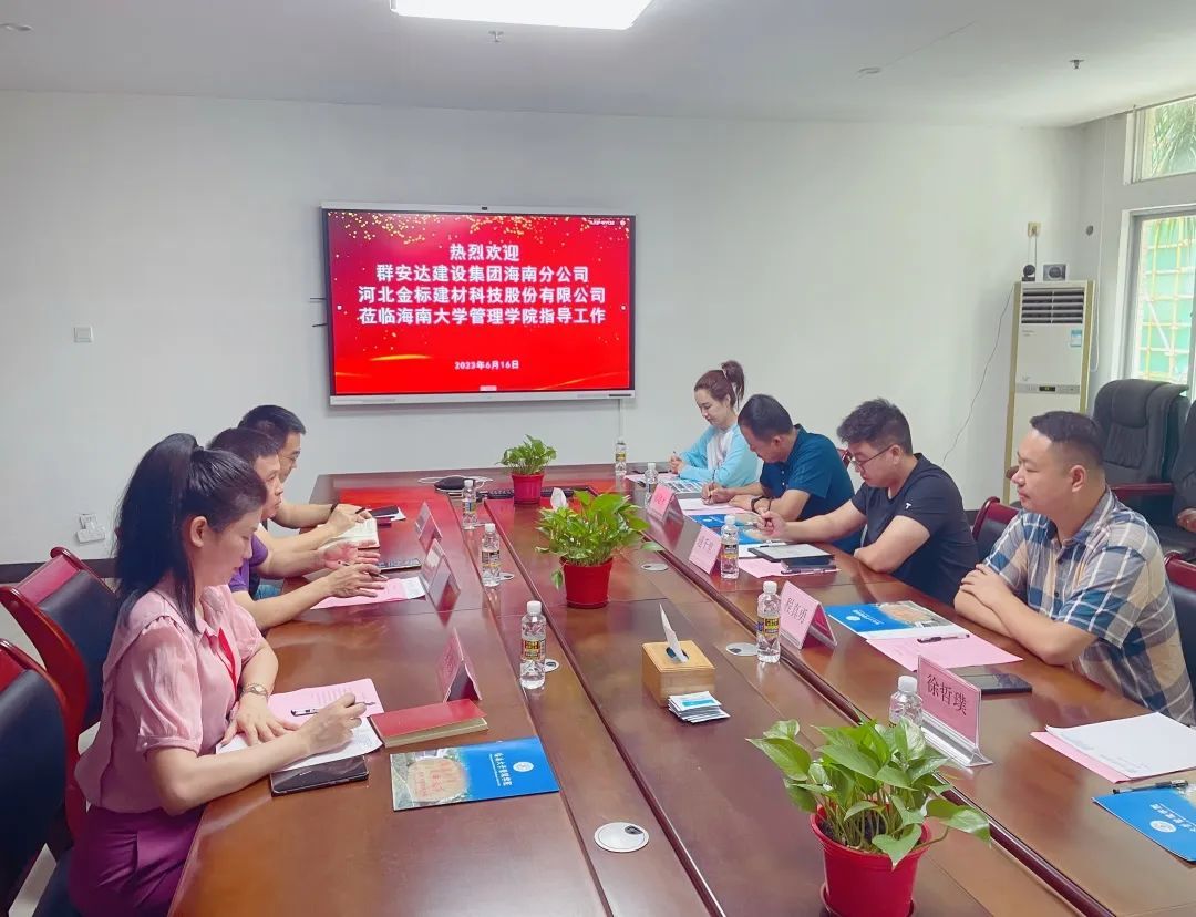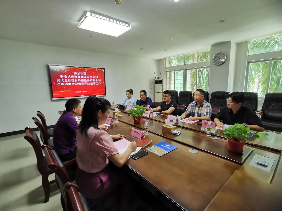 2023年6月16日上午,群安达建设集团海南分公司总经理程真勇、河北金标建材科技股份有限公司(简称金标股份)董事长逯千里、金标股份海南分公司总经理崔建才一行五人到海南大学管理学院就产学研合作事宜洽谈交流。海南大学管理学院副院长许能锐教授、管理学院EDP中心副主任黎光灵、自贸港工商管理领航班项目负责人吴赛环参加交流会。