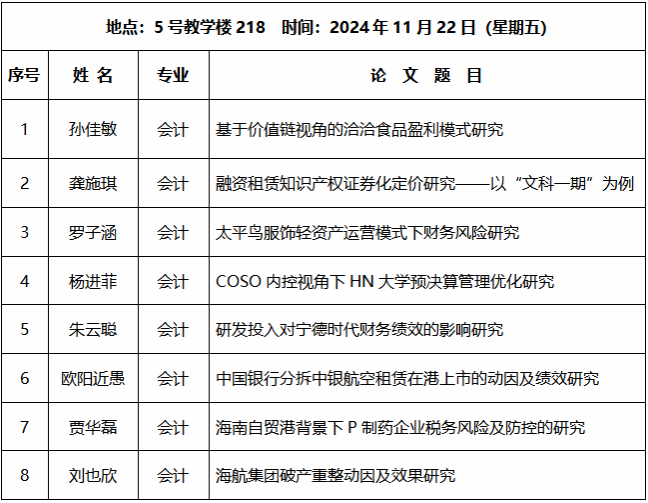 海南大学国际商学院2024年下半年会计硕士学位论文答辩会将于2024年11月22日举行,现将有关事宜公布如下: