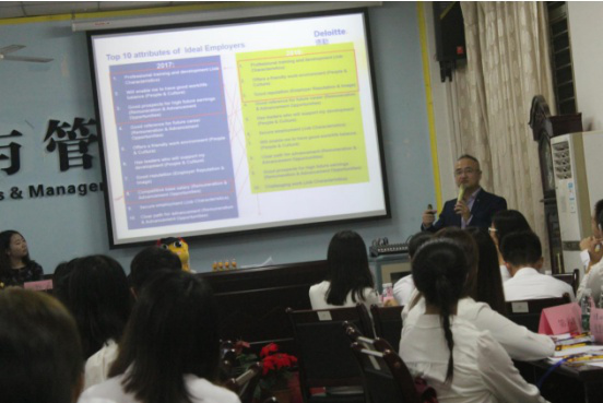 海南大学首次现场直面“四大”面试模拟于2017年11月1日晚在社科楼B-112拉开序幕,活动的对象主要以经管学院ACCA项目学员为主。本次活动的主讲嘉宾为原德勤北方区校园招聘高级经理、北京大学应用心理学硕士曲悲岩老师。活动是在紧张而热烈气氛中进行,并取得圆满成功。本次活动由海南大学经济与管理学院ACCA&CMA项目中心和广州中博教育股份有限公司共同承办。