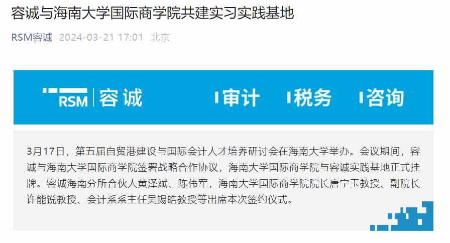 在会议期间签署的战略合作协议,以及随后进行的实习实践基地挂牌仪式。容诚合伙人黄泽斌对海南大学的信任表示感谢,并展望了双方在人才培养、实习实践基地建设等方面的深度合作前景。此篇公众号推文到本文发文前点击量400+。