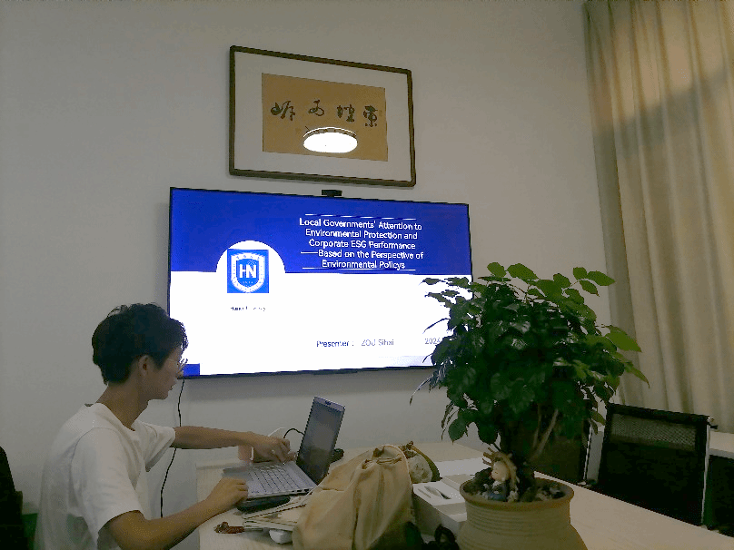 硕士研究生邹四海进行主题汇报,内容为地方环保注意力与企业的ESG表现。主要就该项研究的背景、研究方法、作用机制、研究结果和启示进行分享。不同于以往的论文分享,本次的汇报采用全英文形式,与会人员通过英语进行学术交流。工商管理专业博士研究生Amina(巴基斯坦留学生)分别就ESG表现的数据来源和论文的解释模型两个议题与会上的老师和同学们进行了深入的探讨。讨论之后,黎青松老师作总结与陈述,为本次交流活动画上了圆满的句号。