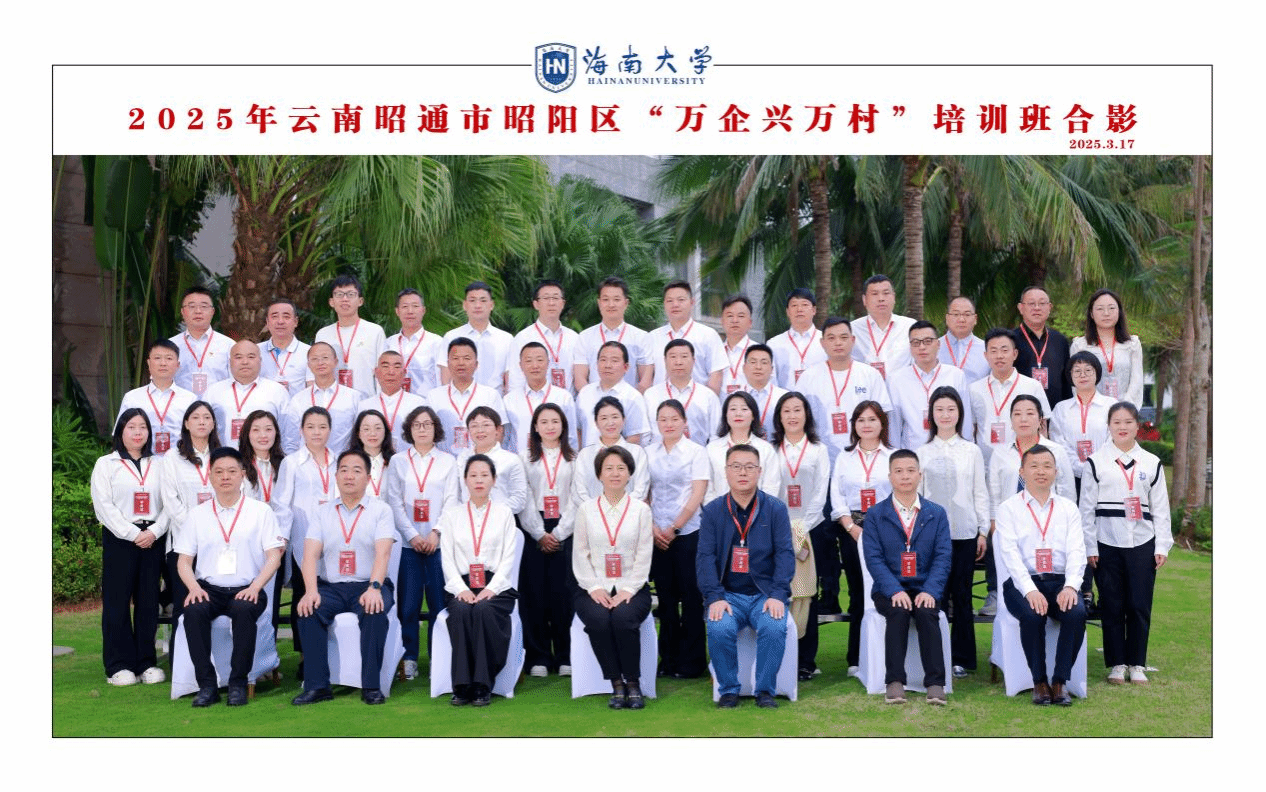 承担的云南昭通市昭阳区“万企兴万村”专题培训班顺利结业。此次培训班共有50名企业家代表赴海南开展为期一周的深度学习与实地考察。本次培训以“理论+实践”为主线,聚焦乡村振兴新路径、新技术与新政策,通过专题讲座、座谈交流、实地走访等形式,为企业家赋能,助力昭阳区乡村高质量发展。